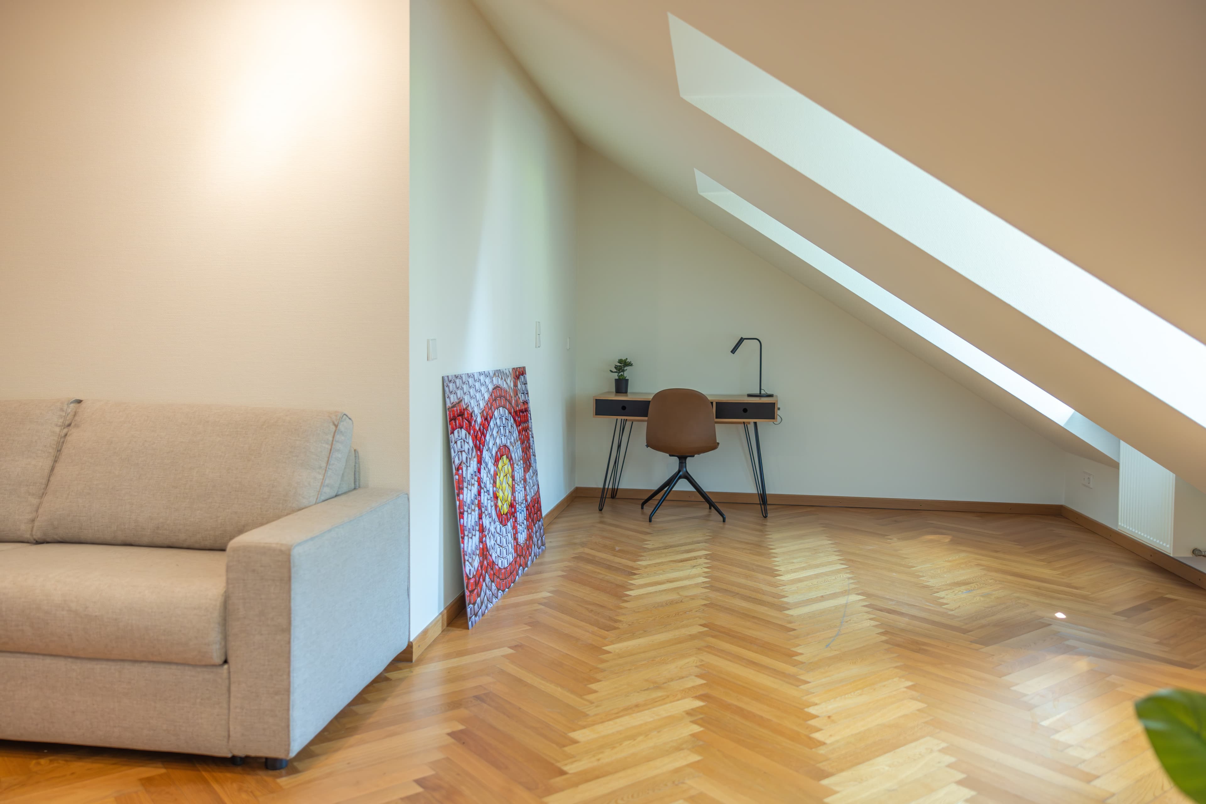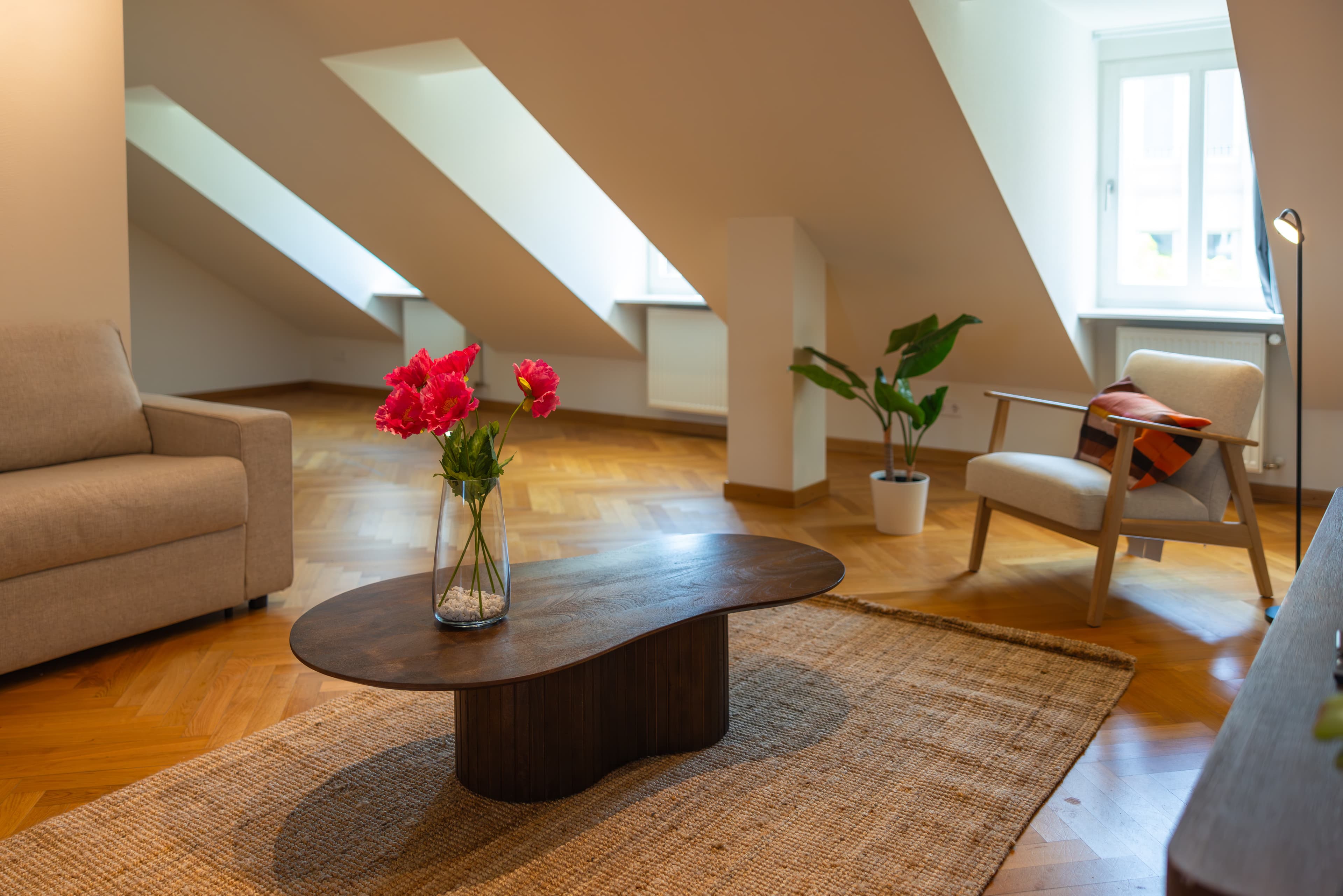 Situated in an iconic residence on Luxembourg’s renowned Grand Rue, right in the heart of the city, this well-appointed apartment offers a blend of timeless charm and practical comfort. Ideal for both short and extended stays, the apartment features a bright living and dining area with a dedicated workspace and a comfortable 150x180 cm sofa bed, perfect for accommodating two additional guests. The separate bedroom includes a luxurious 200x200 cm bed, ensuring restful nights. A fully equipped kitchen in its own room allows for convenient home cooking, while the modern bathroom comes with a walk-in shower and a washer-dryer. A separate toilet adds to the overall comfort. Linen and towels are provided, so you can settle in with ease.